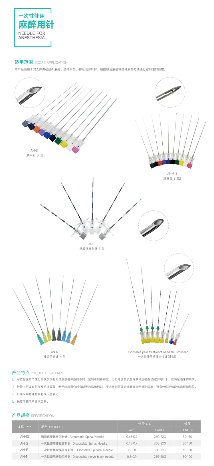 本產(chǎn)品適用于對(duì)人體做硬膜外麻醉、腰椎麻醉、神經(jīng)阻滯麻醉、硬腰聯(lián)合麻醉等各種麻醉方法進(jìn)地穿刺、注射藥物。
