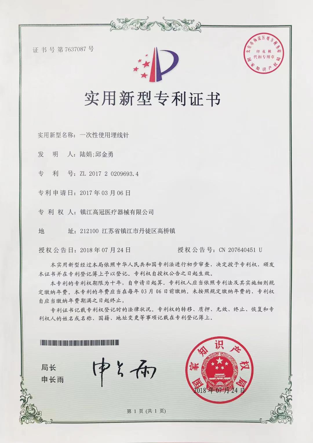 實用新型專利證書(實用新型名稱:一次性使用埋線針 專利號:ZL 2017 2 0209693.4)